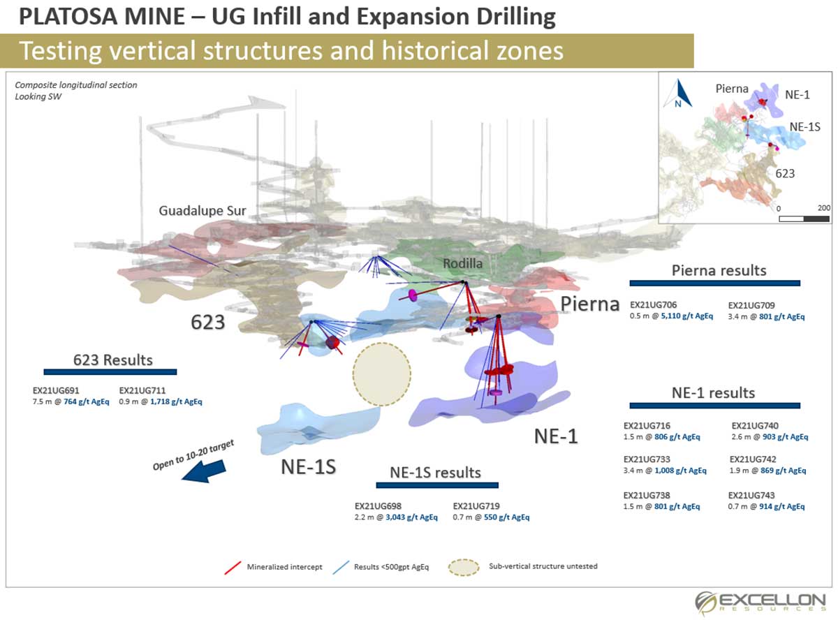 - Follow-up drilling on vertical zone intersected in hole EX21UG690 (2,860 g/t AgEq over 7.5 metres) is underway with assays pending.