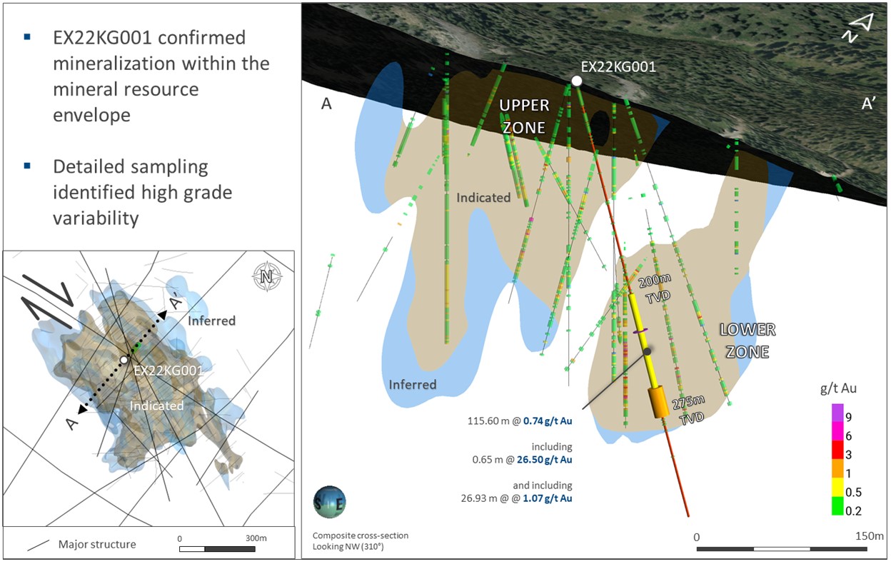 The 2022 drill program at Kilgore focused on confirming the historical and reverse circulation intercepts within the Kilgore deposit, and exploring along the trend and at depth while obtaining structural readings from the oriented core throughout the deposit. Diamond drill hole EX22KG001 was a confirmation drillhole within the current mineral resource envelope identified by the previous drilling. A more detailed sampling was conducted, identifying a high level of grade variability, and control of mineralization by narrow jarosite-filled structures and narrow, high-grade vein stockwork.