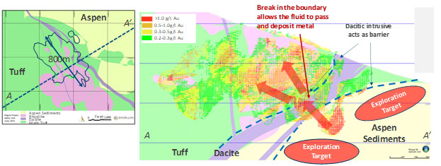 When re-inspecting core, mineralization in the Aspen sediments is associated with quartz stockwork, often hosting visible gold. The nuggety effect of coarse gold within the stockwork, and the historic practise of hydraulic core splitting are likely attributing factors to irregular grade distribution within the Aspen sediments. The current exploration model suggests there are likely multiple sub-vertical higher grade structures as yet unplumbed within the Aspen Formation (Figure 1 below).