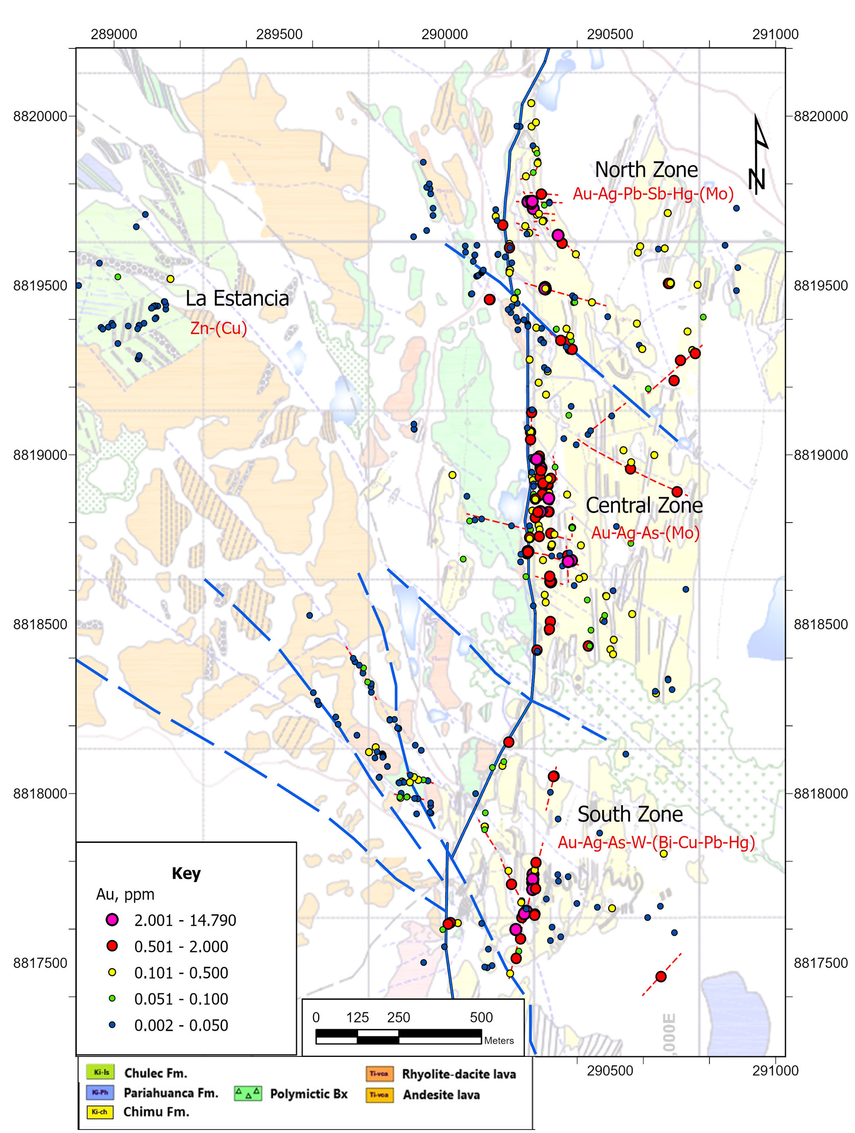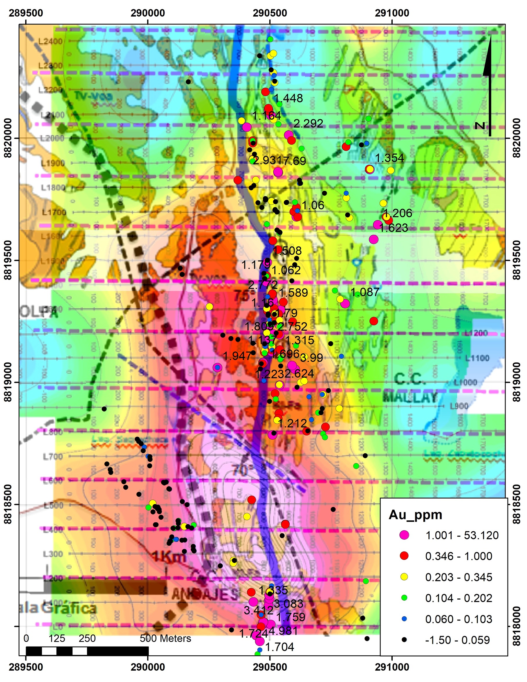 Figure 1. Tres Cerros Au geochemistry including December 2024 surface sampling