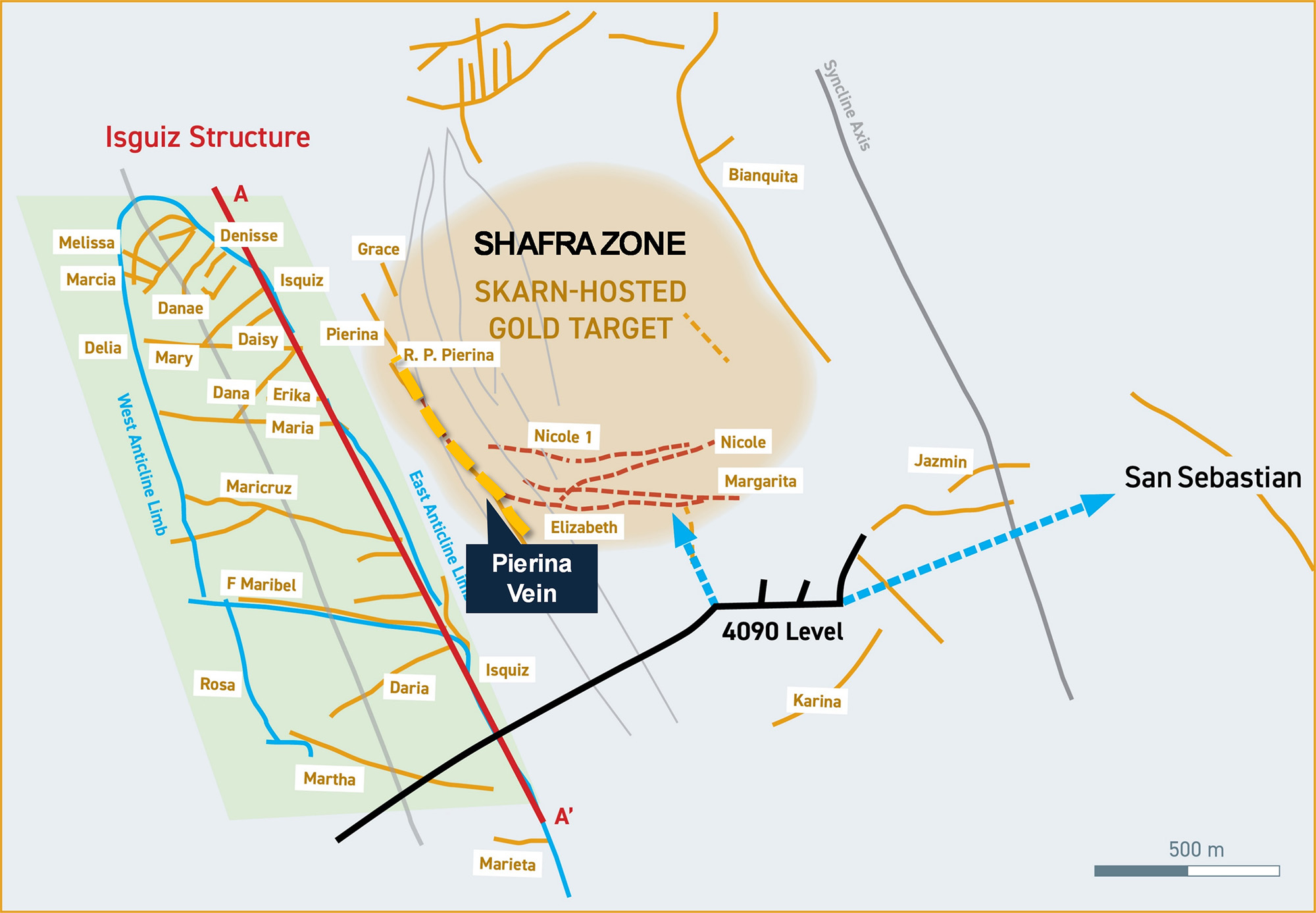 Not only will this deliver additional mineralized material in and around historic upper-level workings; but, as has been confirmed by prior drilling, the mineralization at Isguiz appears to widen substantially with depth.Once underground rehabilitation is completed, we intend to commence drilling below the 4090 level to both confirm these down-dip extensions and expand mineralization, both laterally and to depth. - “Shafra Zone” (also known as the Pierina System): Approximately ~500 metres east of the main Isguiz vein system, the Shafra Zone is a priority gold exploration target defined by historical sampling and early fieldwork that is not reflected in historical resources. While initially recognized by Buenaventura, the Shafra Zone received very little attention until Excellon’s geologists noticed significant gold values in pyritic halos surrounding the (traditional target) Ag-Pb-Zn veins running alongside a large surface depression in limestones adjacent to the main Isguiz mineralization. Excellon’s geologists have re-sampled the surface of this depression (the Shafra Zone), and have confirmed two broad zones exhibiting strongly anomalous gold values – approximately 30% of sample sites recorded +0.5 g/t Au; highest value 62 g/t Au1. These results are historical in nature, have not been independently verified by Excellon and should not be relied upon. Excellon has initiated a re-assay program to validate this legacy data.