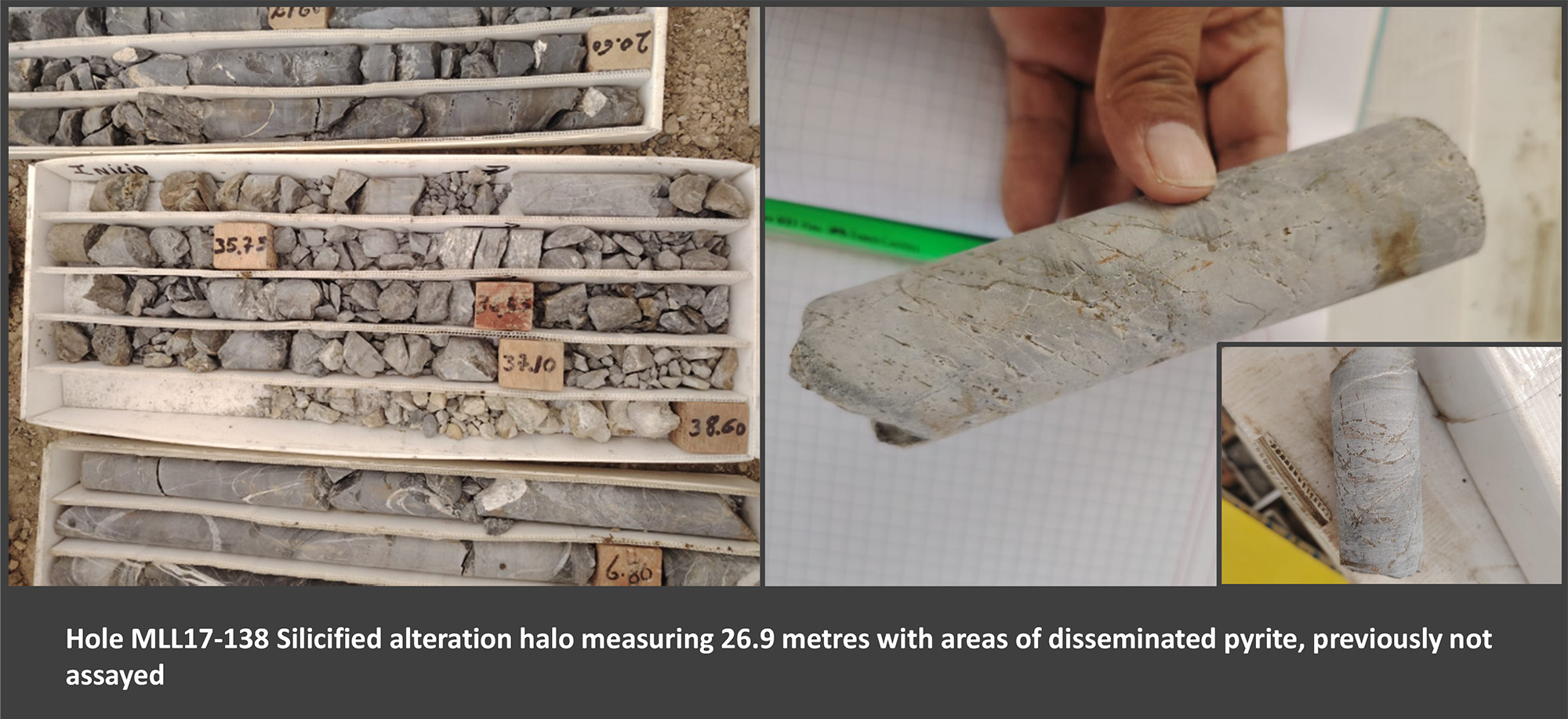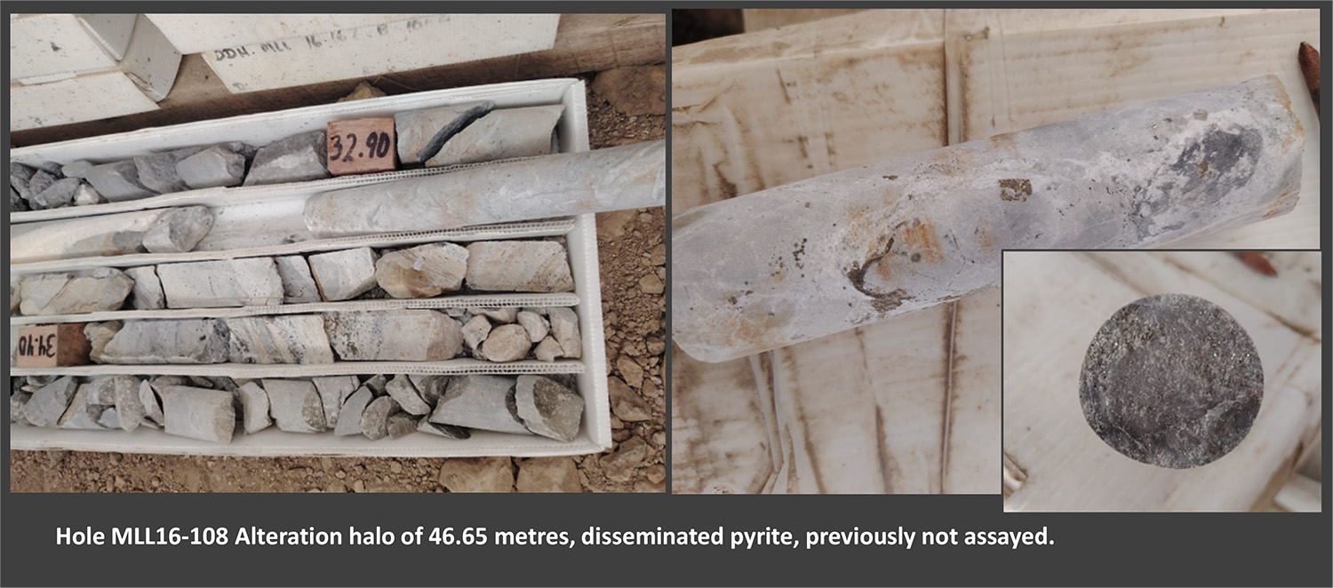 Historical sampling of crosscuts on the Pierina vein, reported by Buenaventura in internal mine reports, recorded anomalous gold results – up to 0.98 g/t Au across 10.5 metres (weighted average).These results have not been verified by Excellon and are subject to confirmation.Historic drill cores into the Shafra Zone (targeting Ag/Pb/Zn mineralization) show broad halos of disseminated pyrite in brecciated, decarbonized, silicified limestone – potentially transitioning into skarn-style mineralization at depth.Most of this pyritic core was never cut or assayed.Excellon has initiated a re-assay program to better define grade distribution and inform a focused drill campaign