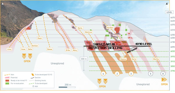 Program Overview: This definition drill program targets currently accessible areas of mineralization along Clavos 2, 3 and 6, along the 4090 level and their downward plunge to a depth of 200 metres to support the mine restart and Mallay mill capacity of 600 tonnes per day. These areas are prioritized for accessibility, known mining widths suitable for mechanized cut-and-fill extraction, and potential to expand on existing mineralization.