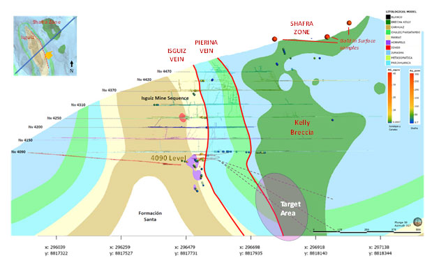 The Mallay mine encompasses several underexplored mineralized systems within reach of the Mallay Ag-Pb-Zn deposit infrastructure, including the Shafra Zone, a broad zone of bleached, structurally deformed limestone which hosts documented gold-enhanced silver-lead-zinc mineralization. This Shafra target, a deep-seated intrusive associated bulk tonnage mineralized host will be prioritized in the initial Mallay exploration drill plan. Evidence for the Shafra target comes from surface sampling, study of available core and interpretation and understanding of local geology and the structure and lithological setting. This includes the presence of a prominent zone of crackle breccia – the Kelly Breccia – which is spatially associated with a swarm of narrow, near-vertical gold-and-silver-rich base metal carrying veins.