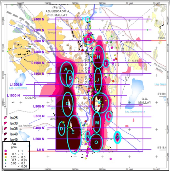 Exploration by Excellon and predecessor Buenaventura identified a strong, 2.5-kilometre-long, north-south trending zone of coincident IP, geochemical and satellite spectral anomalies which extend to the southern margin of the Company’s original tenements. The geophysical anomaly trends are open to the north and south beyond the limits of the historical survey coverage. Mapped controlling structures and spectral anomalies are interpreted to continue into the newly acquired concessions. The acquired area also hosts a large intrusive body which is interpreted to be related to the Tres Cerros mineralizing event.