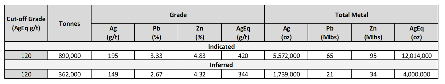 - Indicated Mineral Resources: 890,000 tonnes grading 195 g/t silver, 3.33% lead and 4.83% zinc. The Indicated mineral resource includes 5.57 Moz of silver, 65 Mlbs of lead and 95 Mlbs of zinc.