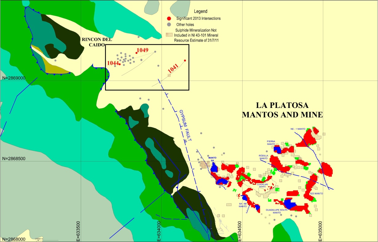 In addition to LP1041, LP1044 and LP1049, 23 holes (12 Source and 11 manto, including two abandoned because of technical difficulties), have been drilled at Platosa since the drill results released on January 17, 2013. While none of the 23 encountered significant sulphides, the Rincon and Rincon-Mantos Corridor holes encountered skarnified marble and the manto holes all encountered the favourable limestone unit, adding to the geological knowledge of both environments.